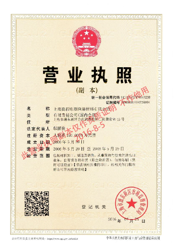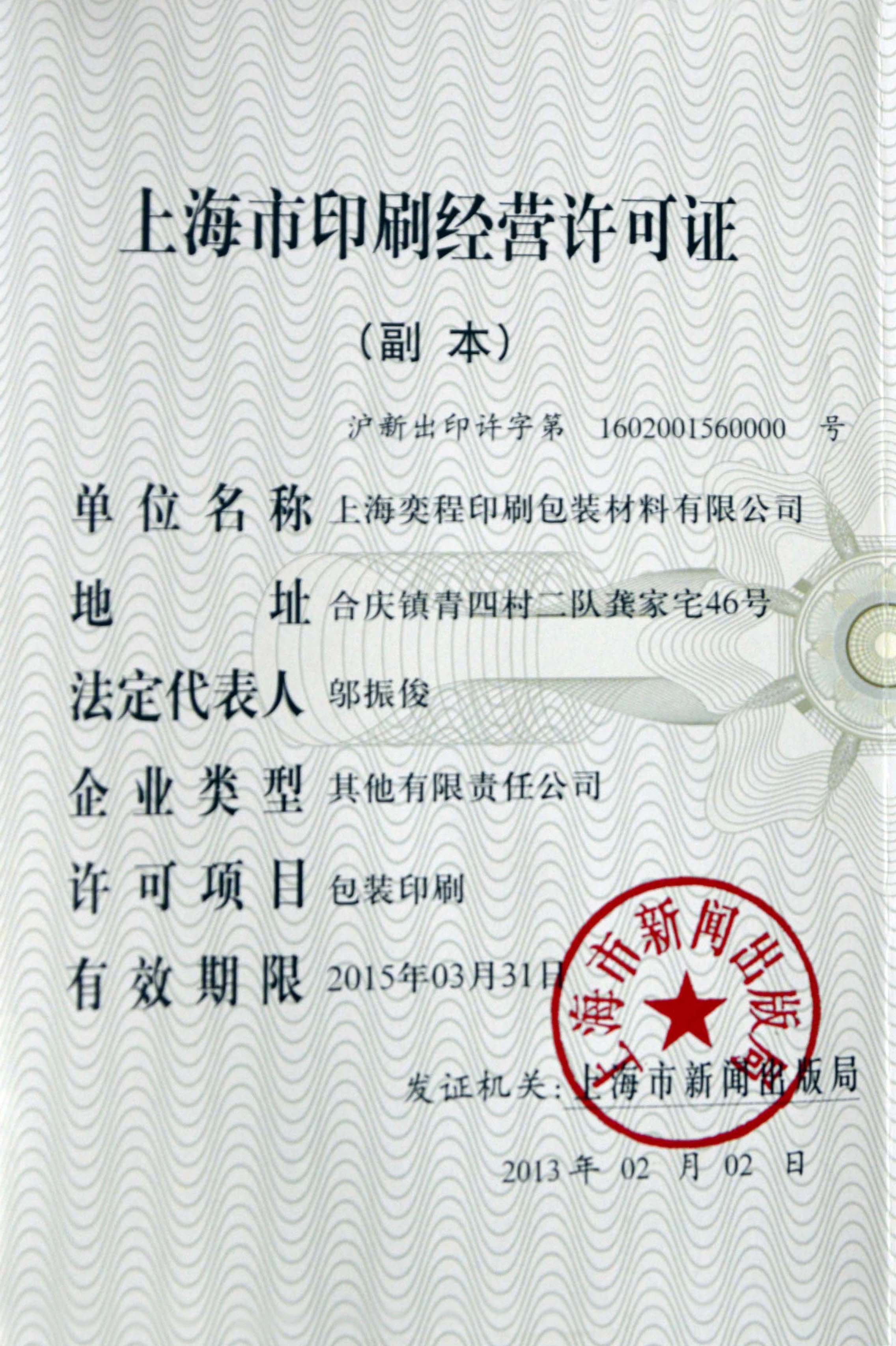 上海奕程印刷包裝材料有限公司 地址:上海浦東新區(qū)華夏東路4220號(hào)